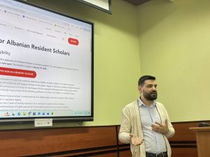 Gjatë takimit, z. Enrik Keco menaxher projektesh pranë American Development Foundation (AADF) i njohu të pranishmit me procedurën e aplikimit, kriteret e përzgjedhjes dhe afatet, si dhe me mundësitë që ofron programi READ për përfshirjen e diasporës akademike në zhvillimin e kërkimit shkencor në Shqipëri.